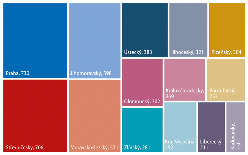 Absolutně nejvíce osob zařazených mezi pracovní sílu je v Praze (celkem 730,1 tisíce osob patří mezi zaměstnané nebo nezaměstnané). Vysoké počty najdeme i v krajích Středočeském (705,8 tis.), Jihomoravském (597,5 tis.) a Moravskoslezském (571, 3 tis.). Populačně malé kraje mají ekonomicky aktivních osob přirozeně méně. V Karlovarském kraji mezi pracovní sílu spadá 150,4 tisíce osob, v Libereckém 210,8 tisíce.