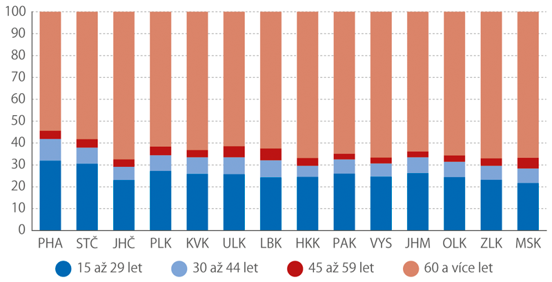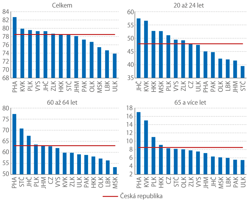 Naproti tomu velké rozdíly najdeme v zaměstnanosti nejmladších a nejstarších obyvatel. V míře zaměstnanosti osob ve věku 60–64 let je mezi kraji s nejvyšší a nejnižší hodnotou rozdíl 24 p. b. Starší lidé zůstávají déle pracovně aktivní zejména v krajích s většími městy, kde nacházejí více možností k pracovnímu uplatnění, např. v maloobchodě nebo jako seniorní experti. Tam, kde takové příležitosti nejsou, je více rozšířen časnější odchod do důchodu a zařazení mezi nepracující důchodce.