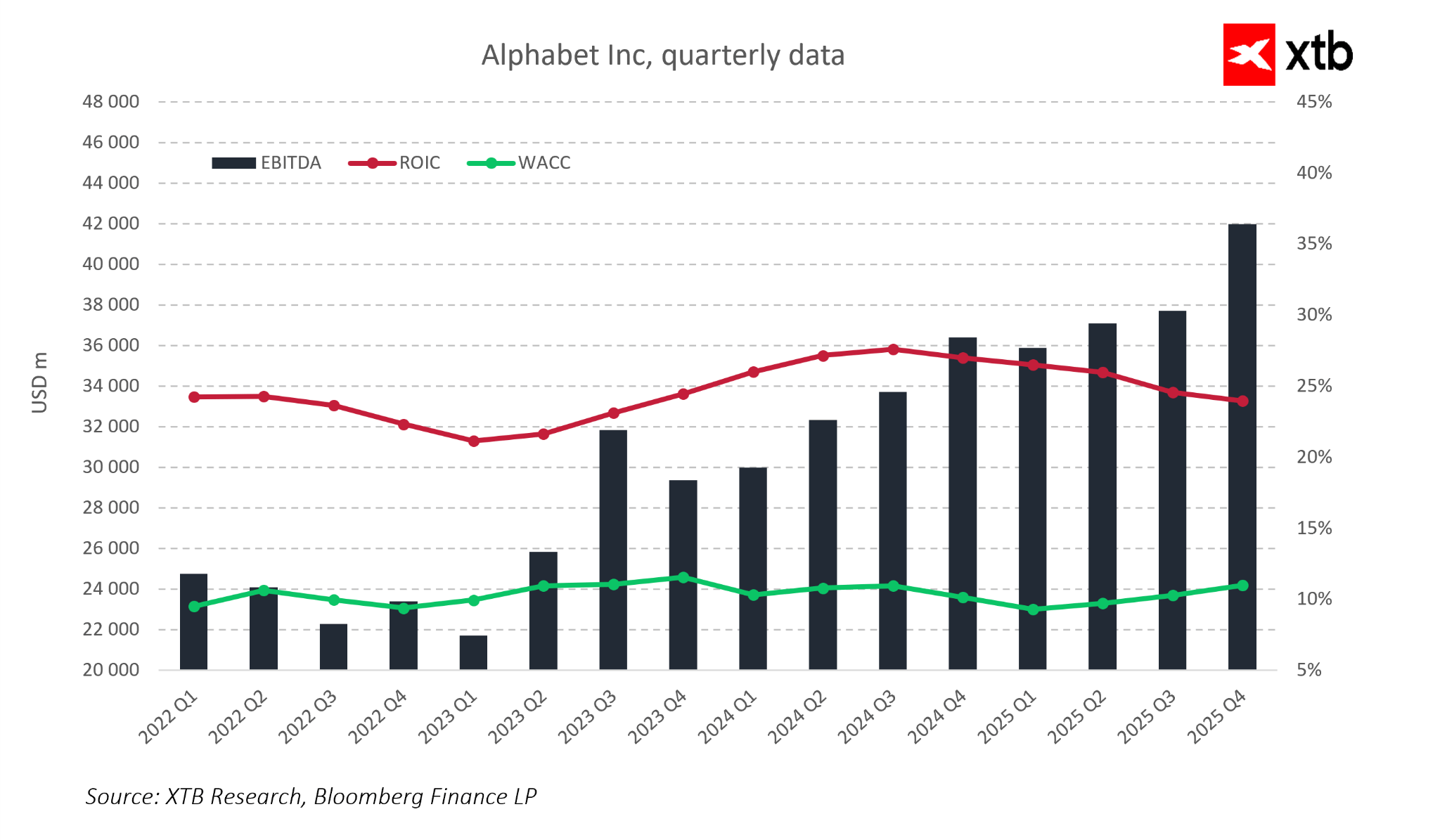 Ukazatele EBITDA a návratnosti investovaného kapitálu potvrzují, že Alphabet vytváří hodnotu převyšující náklady kapitálu a růst EBITDA ukazuje zdravou rovnováhu mezi expanzí podnikání a nákladovou efektivitou.