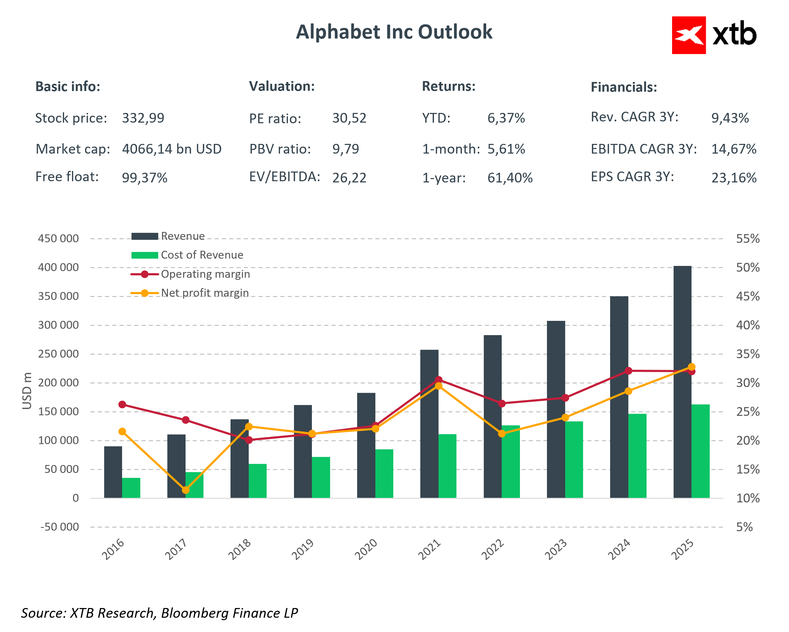 Alphabet je jedním z největších světových hráčů v technologickém sektoru, poskytuje pokročilá řešení v oblasti vyhledávání, reklamy, digitálních předplatných a cloudových služeb. Společnost těží z rostoucí poptávky po umělé inteligenci a cloudových řešeních a strategické investice do rozvoje Google Cloud a integrace AI do segmentu Google Services vytvářejí pevný základ pro další růst.