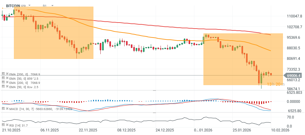Bitcoin dnes klesá k úrovni 69 000 USD a graf ukazuje zřetelné podobnosti mezi výprodejem z konce října, kdy cena spadla přibližně ze 112 000 USD na 80 000 USD, a nejnovější sestupnou vlnou zhruba z 97 000 USD na 60 000 USD.