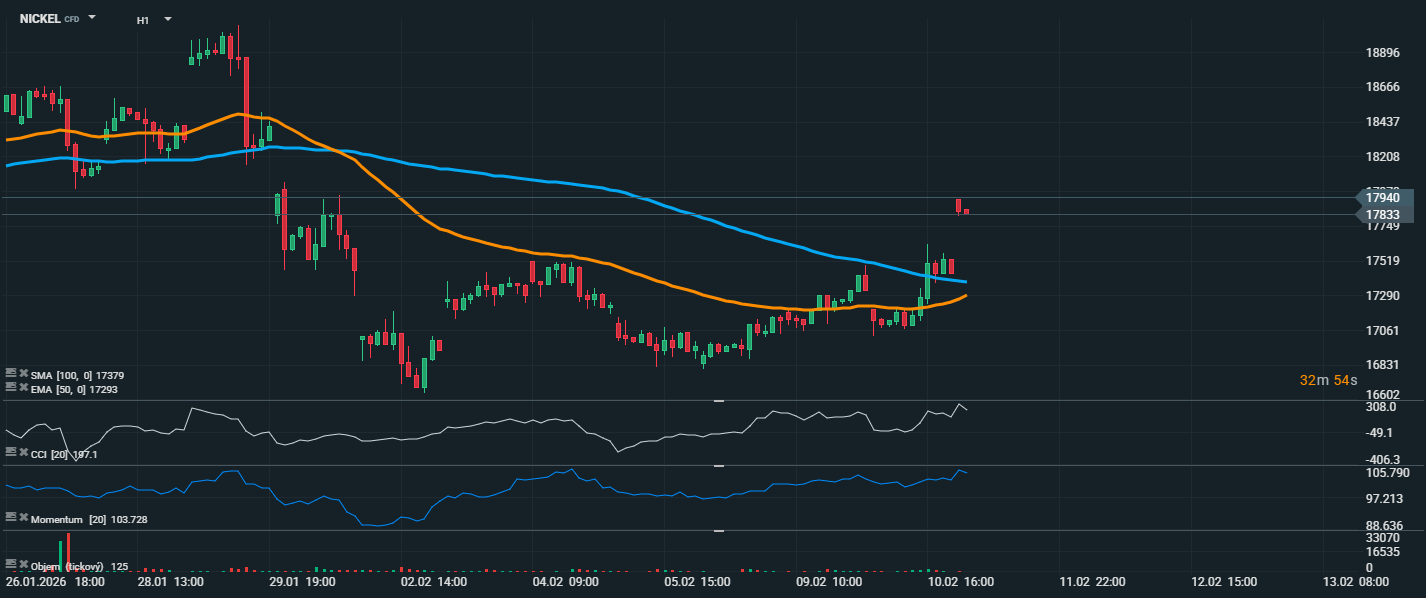 Cena nicklu se aktuálně obchoduje v oblasti 17 830–17 940 USD. Po delší konsolidaci a postupném růstu došlo k prudkému impulzu směrem vzhůru, kdy cena prorazila nad oba klouzavé průměry – EMA 50 (17 293 USD) i SMA 100 (17 379 USD). Tento průraz představuje důležitý technický signál, jelikož SMA 100 dosud fungovala jako dynamická rezistence v rámci klesajícího trendu. Krátkodobě vidíme silnou býčí svíčku s následnou mírnou korekcí, což je přirozená reakce po rychlém růstu. Důležité však je, že cena se nad průměry zatím drží, čímž potvrzuje změnu krátkodobého sentimentu. CCI dosahuje hodnoty 197, což znamená hlubokou překoupenost trhu. Takto vysoká úroveň indikuje velmi silný nákupní tlak, ale zároveň výrazně zvyšuje pravděpodobnost krátkodobé korekce nebo alespoň zpomalení růstu. Momentum je nad hodnotou 100, což potvrzuje rostoucí dynamiku trhu. Z technického hlediska je nyní klíčové sledovat, zda se cena udrží nad oblastí 17 750–17 800 USD, která představuje nově vytvořenou podporu. Pokud ano, může následovat pokračování růstu směrem k 18 000 USD a výše. Naopak návrat pod SMA 100 by znamenal falešný průraz a riziko obnovení klesající struktury.