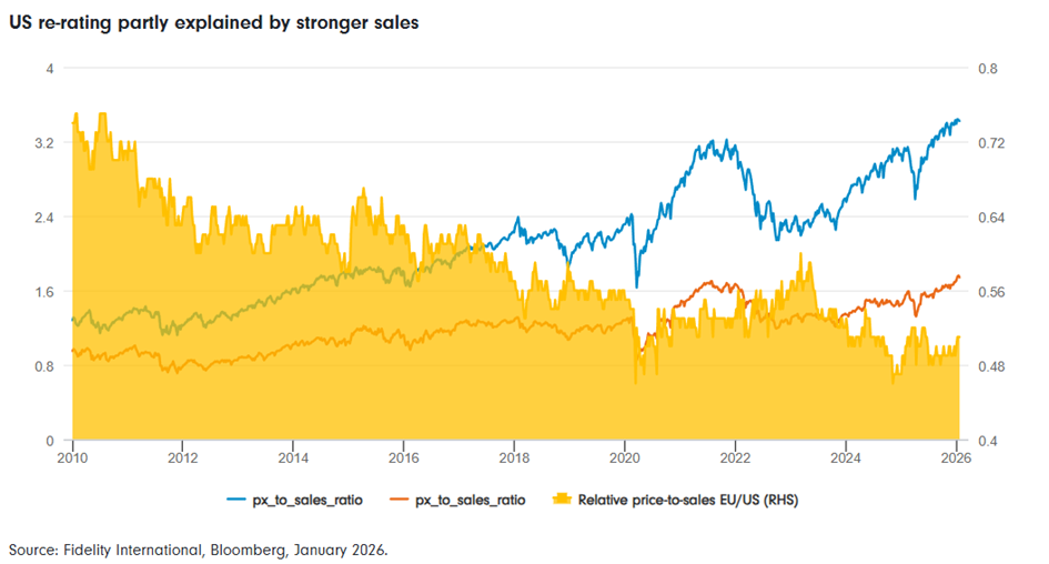 Je však třeba dodat dvě věci. Zaprvé, část růstového rozdílu je cyklická – Evropa byla více vystavena opakovaným makroekonomickým šokům. Zadruhé, rozdíl v ocenění se rozevřel mnohem více než samotný rozdíl v růstu.