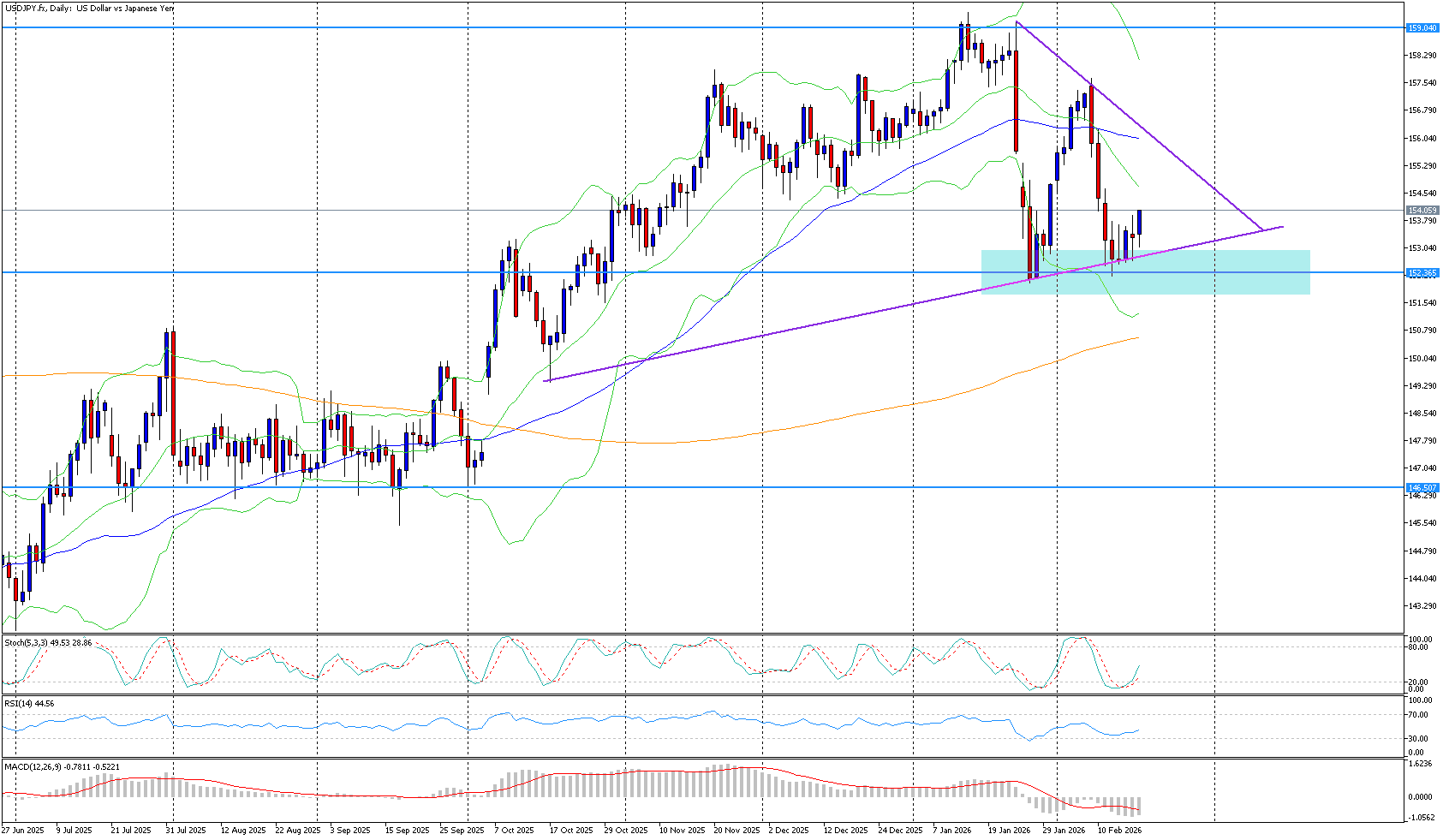Měnový pár USD/JPY v aktuální seanci mírně posiluje a postupně koriguje ztráty z předchozího dne, když se obchoduje lehce nad úrovní 153,50. V posledních pěti obchodních dnech se kurz pohyboval v úzkém rozpětí kolem 153,00, tedy těsně nad vzestupnou trendovou linií vedenou od října. Tato linie nadále představuje klíčový technický referenční bod, který odděluje zachování širšího růstového trendu od jeho potenciálního narušení. Fundamentální pozadí přineslo smíšené signály. Nejnovější data z Japonska ukázala, že lednový obchodní deficit byl nižší, než trh očekával. K lepšímu výsledku přispěl silnější vývoz, kdy robustní poptávka z asijských ekonomik kompenzovala slabší dodávky do Spojených států. Přestože tato čísla krátkodobě podpořila jen, reakce trhu zůstala omezená a USD/JPY se drží v konsolidačním režimu. Technický obraz však nadále naznačuje přetrvávající medvědí momentum. MACD se pohybuje hluboko v záporném teritoriu a zůstává pod svou signální linií, což potvrzuje převažující tlak na oslabení dolaru vůči jenu. RSI osciluje mezi neutrální hranicí a pásmem přeprodanosti, přičemž se snaží stabilizovat bez jasného signálu obratu. Tato konfigurace ukazatelů naznačuje, že případné růstové pohyby mohou zatím narážet na omezený prostor. Pokud by USD/JPY pokračoval v růstu, prvním cílem by byla oblast 154,50, kde dochází ke konfluenci 20denního a 100denního jednoduchého klouzavého průměru. Tato zóna představuje bezprostřední technickou překážku. Nad ní se nachází 50denní SMA na 156,00, která může fungovat jako výraznější rezistence. Další významná bariéra leží na 157,50, kde se kurz zastavil 9. února a kde by se mohl znovu objevit silnější prodejní tlak. Naopak obnovení poklesu by mohlo přivést pár k oblasti 151,00–151,50, kde se nachází spodní Bollingerovo pásmo a kde by mohlo dojít k testu krátkodobé podpory. Níže pak leží klíčová zóna 150,00–150,50, kde se koncentruje 200denní SMA, která z pohledu střednědobého trendu představuje zásadní úroveň. Její prolomení by výrazně zhoršilo technický výhled. Celkově se USD/JPY snaží udržet nad vzestupnou trendovou linií, přestože indikátory momenta nadále reflektují medvědí tendenci. Trvalejší průlom nad 154,50 by mohl stabilizovat krátkodobé momentum a posunout technický obraz směrem k neutrálnímu nastavení.
