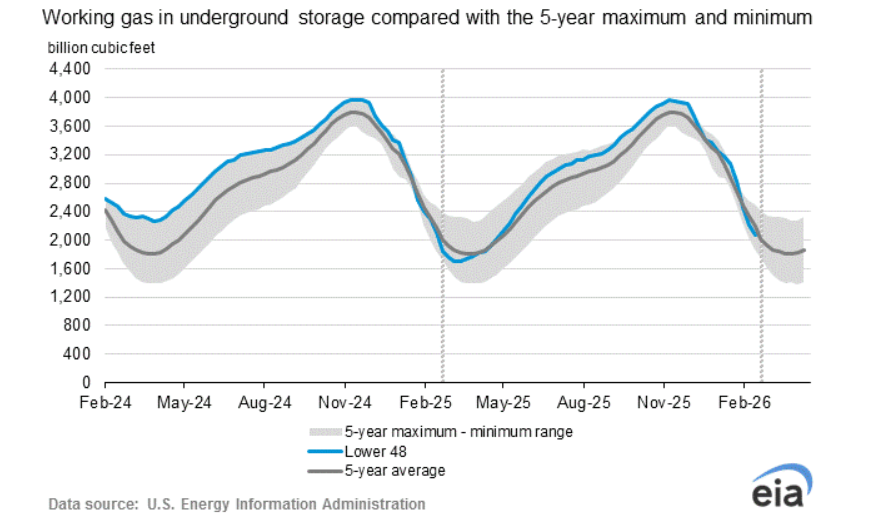 Podle nejnovější zprávy EIA (U.S. Energy Information Administration) dosáhly zásoby zemního plynu v USA ke dni 13. února 2026 úrovně 2 070 Bcf. Oproti předchozímu týdnu (2 214 Bcf) jde o výrazný pokles o 144 Bcf.