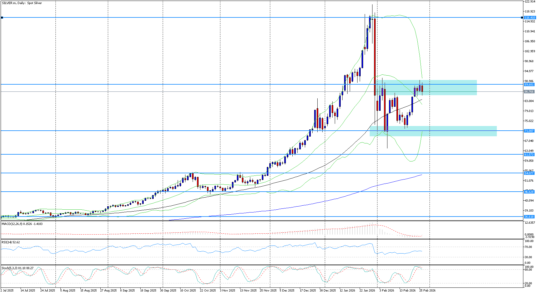Cena stříbra mírně ustupuje pod hranici 87,00 a koriguje část předchozích zisků, přičemž se již čtvrtou obchodní seanci drží v úzkém pásmu kolem 87,30. Tento pohyb následuje po výrazné čtyřdenní rally, která vynesla kov z 72,00 až k 88,00. Současná konsolidace naznačuje vyčkávací postoj investorů, kteří pozorně sledují vývoj jednání mezi USA a Íránem. Washington požaduje, aby Teherán upustil od svých jaderných ambicí, zatímco prezident Trump otevřeně varoval před možností vojenské reakce v případě odmítnutí dohody. Historicky má stříbro tendenci těžit z období zvýšeného geopolitického napětí, což zůstává podpůrným faktorem. Technický obraz je aktuálně vyvážený. RSI se stabilizoval mírně nad neutrální úrovní 50, což odráží absenci výraznějšího směrového tlaku. MACD se pohybuje lehce nad nulovou linií a setrvává nad svou signální linií, což naznačuje mírně pozitivní momentum. Zároveň se výrazně zúžil interval mezi Bollingerovými pásmy, což signalizuje pokles volatility a potenciální přípravu trhu na výraznější pohyb v jednom ze směrů. V případě obnovení růstu by první test představovala hranice 90,00. Její překonání by otevřelo prostor směrem k 95,00, kde by se cena mohla dostat na nejvyšší úrovně od konce ledna. Další významná bariéra leží poblíž 100,00, která představuje silnou psychologickou i technickou rezistenci. Na opačné straně by případná korekce mohla nejprve narazit na podpůrné pásmo 81,00–83,00, kde se sbíhají 20denní a 50denní SMA. Níže se nachází klíčová oblast kolem 70,00, zahrnující 100denní SMA a spodní Bollingerovo pásmo, což z této zóny činí významnou technickou oporu. V případě hlubšího oslabení by další stabilizační úroveň mohla ležet kolem 65,00, kde trh našel podporu 6. února. Celkově se stříbro nachází ve fázi konsolidace s utlumenou volatilitou, přičemž další směr bude pravděpodobně určen výsledkem jednání mezi USA a Íránem. Produktivní dohoda by mohla vyvolat korekci směrem k hlavním podpůrným úrovním, zatímco eskalace napětí by mohla obnovit tlak na růst.
