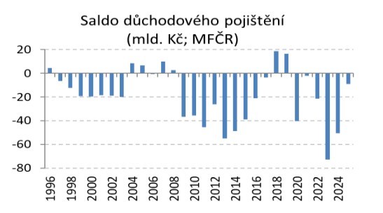 Zajímavý je ovšem, výhled důchodů v dalších letech a desetiletích. Loňské propočty Národní rozpočtové rady naznačily, že nás v nejbližších cca 15 letech čeká přechodné období přebytků (přičemž bez nedávné „Jurečkovy“ změny parametrů, resp. při její reverzi, kterou hrozil nový ministr Juchelka, by toto období bylo o cca 5 let kratší). Po skončení této pozitivní fáze pak přijde mnohem delší a výraznější fáze negativní.