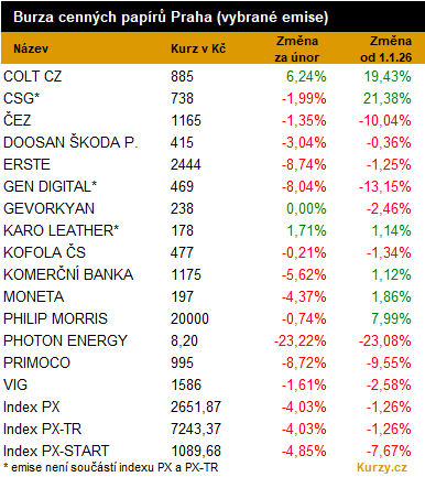 Informace o zavedení nových cel ze strany Donalda Trumpa nakonec v týdnu na trhy ve světě vesměs negativně nezapůsobily. Dalo by se říci, že spíše na klesající domovskou Wall Street, kde však sehrálo svůj vliv pokračující nervózní dění ohledně dopadů AI, potažmo firemní zprávy v čele se společností NVIDIA. Pražská burza se vydala svou cestou. Po předchozím nádechu se nasměrovala zpět výrazně na jih, zatímco evropské trhy nakonec týden zakončily zeleně neutrálně. Prestižní EURO STOXX 50 ve čtvrtek dokonce zaznamenal nová historická maxima u hranice 6 200 b. Index PX sice v úvodu února zaznamenal také nová historická maxima, od nich však již nyní ztrácí přes 5 %. V týdnu odepsal 2,21 %, za celý únor nakonec 4 %. Vyplnil se tak výhled zmiňovaný před měsícem v článku „Pražská burza zakončila týden pod vlivem neúspěchu ČEZ v arbitráži“. Zkrátka pražská burza po šňůře devíti měsíců růstu v únoru již značně oslabila. Navíc za poslední více než dva roky více odepsala jen loni v dubnu.