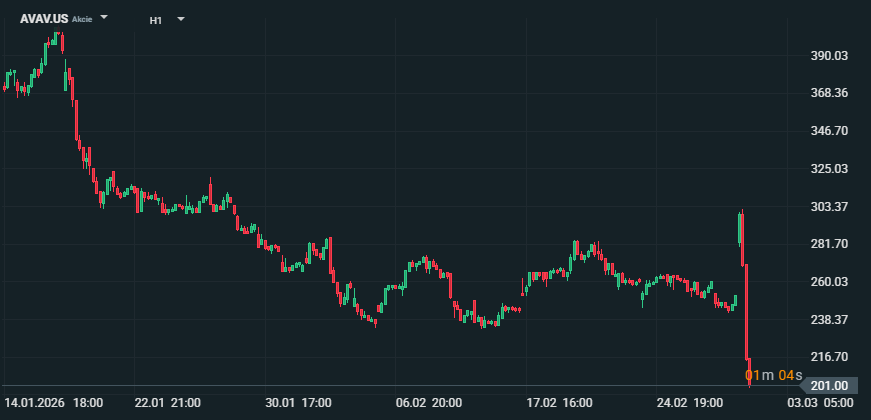 Akcie AeroVironment (AVAV) se 2. března 2026 propadly zhruba o 18–20 % poté, co se ranní růst rychle otočil do silného výprodeje. Hlavním impulzem bylo snížení doporučení od Raymond James na Underperform, které znovu otevřelo téma nejistoty kolem programu SCAR u U.S. Space Force a jeho dopadu na backlog i viditelnost budoucích tržeb. Zdroj: xStation5