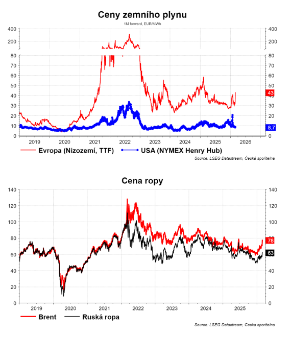 Íránské drony zasáhly největší saúdskou rafinerii Ras Tanura a katarský energetický komplex Ras Laffan. Cena ropy Brent vyskočila až o 14 % k hranici 82 USD, zatímco ceny plynu v Evropě v reakci na útoky v Kataru vyletěly o rekordních 54 %. Tankerová doprava Hormuzským průlivem, kudy protéká pětina světové ropy a čtvrtina LNG, se prakticky zastavila z důvodu ztráty pojištění proti válečným rizikům. Když zasadíme tyto růsty do střednědobého kontextu, energetické krize 2021-2022, tak to zatím nevypadá dramaticky. Proto je potřeba si uvědomit, že v případě delší krize nárůst bude výrazně vyšší.
