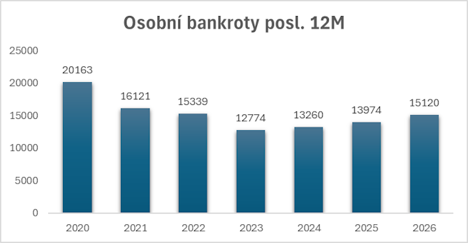 V období od března 2025 do konce února letošního roku se oproti předchozímu období počet osobních bankrotů zvýšil ve 12 ze 14 krajů. Nejvyšší růst vykázal Jihomoravský kraj spolu s krajem Vysočina, a to shodně o 22 %. O 14 % více osobních bankrotů bylo v Jihočeském kraji. V Praze se jejich počet zvýšil o 13 %. Shodně o 12 %, tedy o více než desetinu, vzrostl počet bankrotů v Plzeňském a Středočeském kraji.