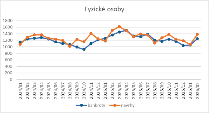 Graf 1: Počet osobních bankrotů a návrhů na ně od ledna 2024 do února 2026