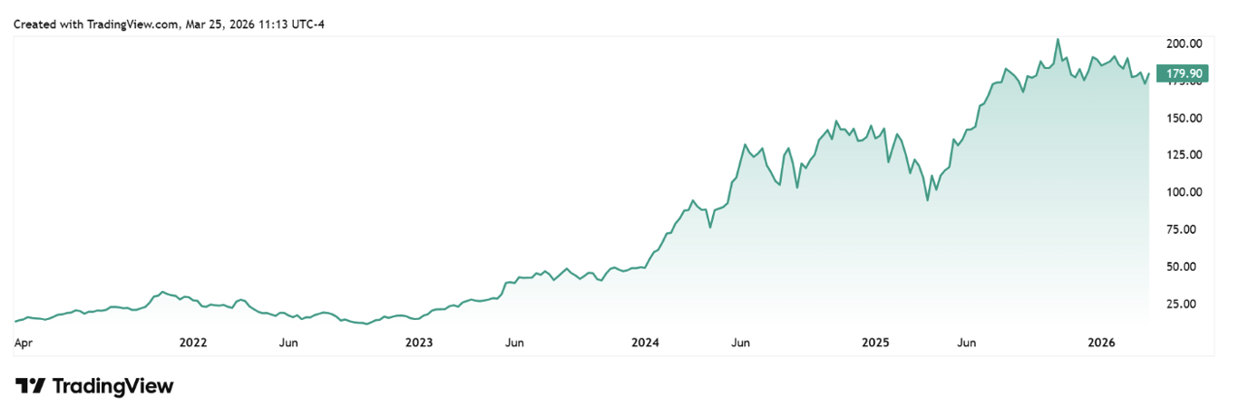 Výkonnost akcií společnosti Nvidia za posledních pět let* Zdroj: TradingView