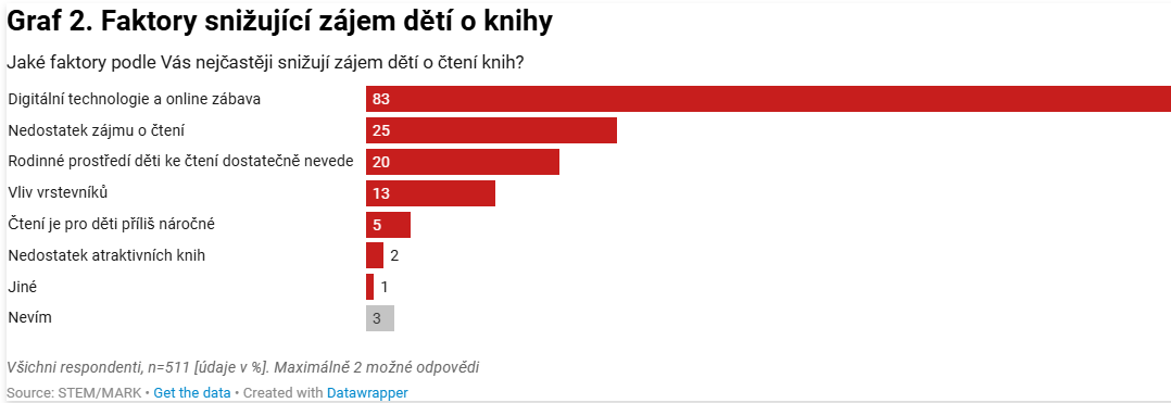 Většina české veřejnosti se shoduje, že děti dnes čtou méně než v minulosti, vyplývá z průzkumu agentury STEM/MARK. Za hlavní příčinu označují lidé jednoznačně digitální technologie, významnou roli ale přisuzují i rodinnému prostředí. Výsledky zároveň ukazují, že vlastní čtenářská zkušenost respondentů silně ovlivňuje jejich pohled na čtení současné generace dětí.