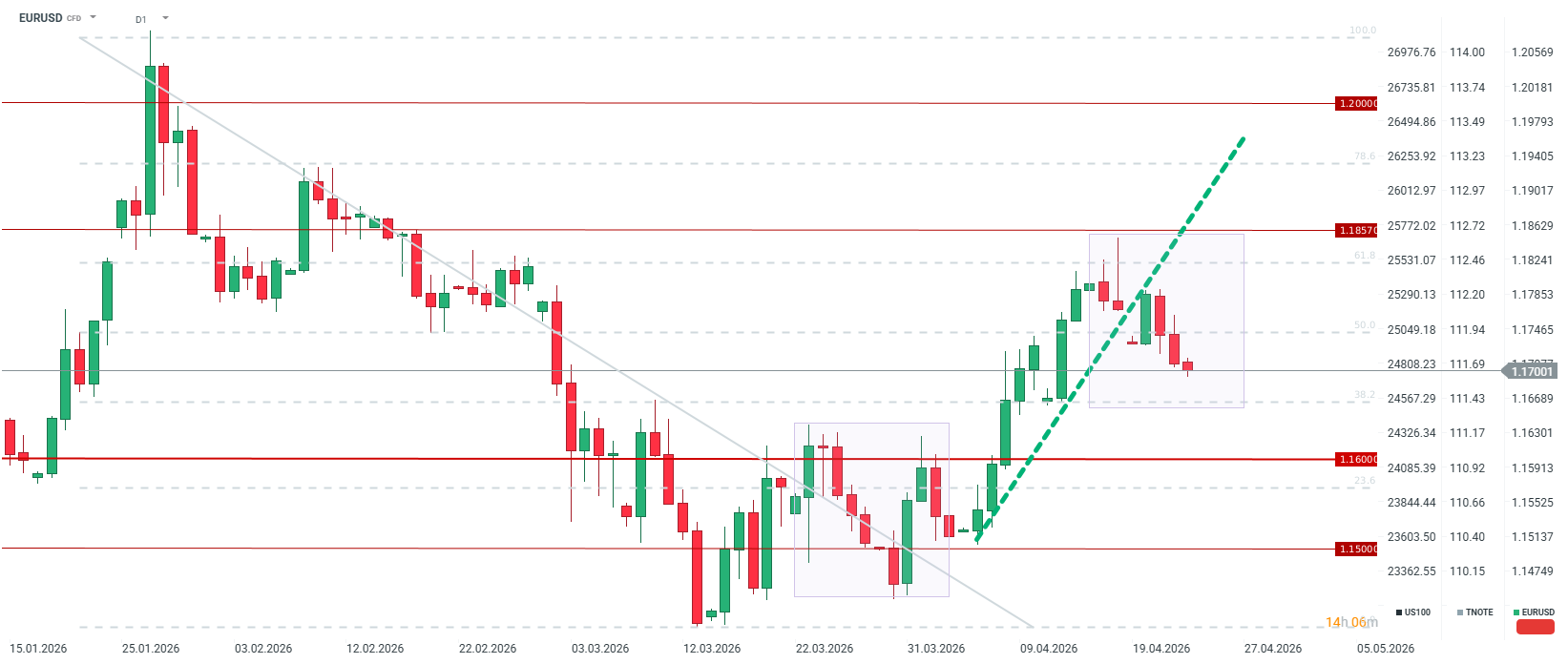 Po slabých evropských datech a přetrvávajícím geopolitickém riziku pár EURUSD prodloužil svůj sestupný pohyb, přičemž další tlak přinášejí rostoucí výnosy amerických vládních dluhopisů. Měnový pár aktuálně testuje úroveň 1,1700, což představuje jeho nejvýraznější medvědí vlnu od konce března.